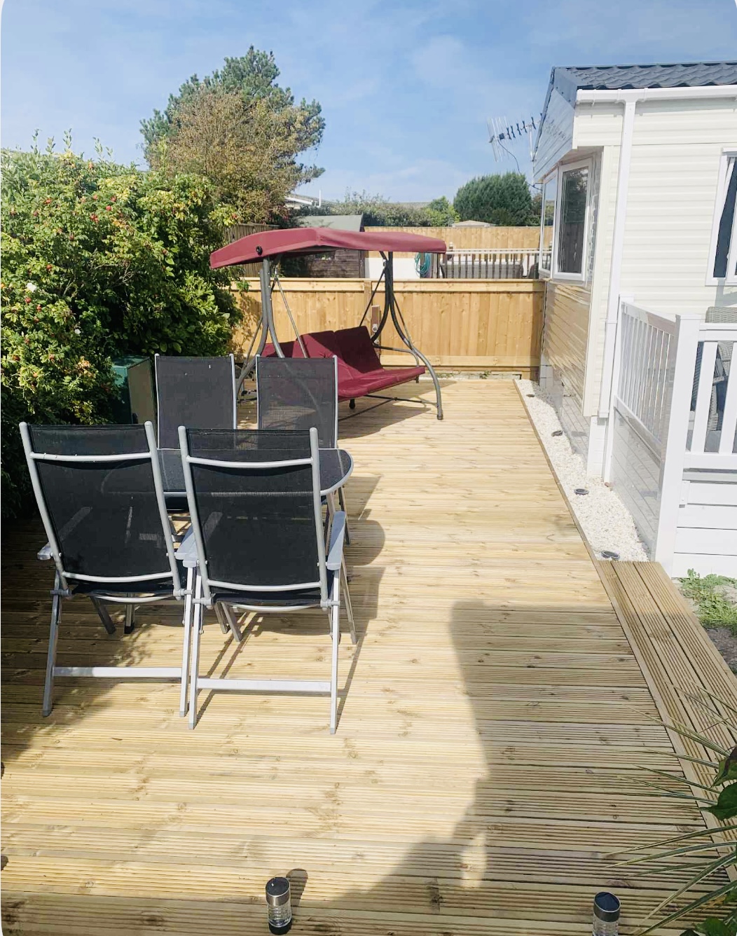 Outside you have a fully enclosed decked area which is perfect for enjoying a sundowner at the end of the day and there is private parking alongside.