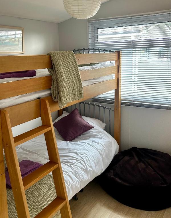 The chalet has 2 bedrooms – 1 double bed and 1 set of bunks, a full bath with shower option, a fully equipped kitchen with a coffee machine, with additional amenities including a refrigerator, microwave, oven, stovetop, toaster etc and a dining table within the open plan living area.