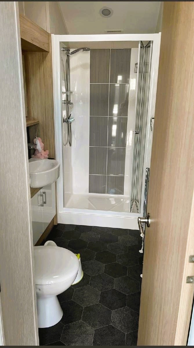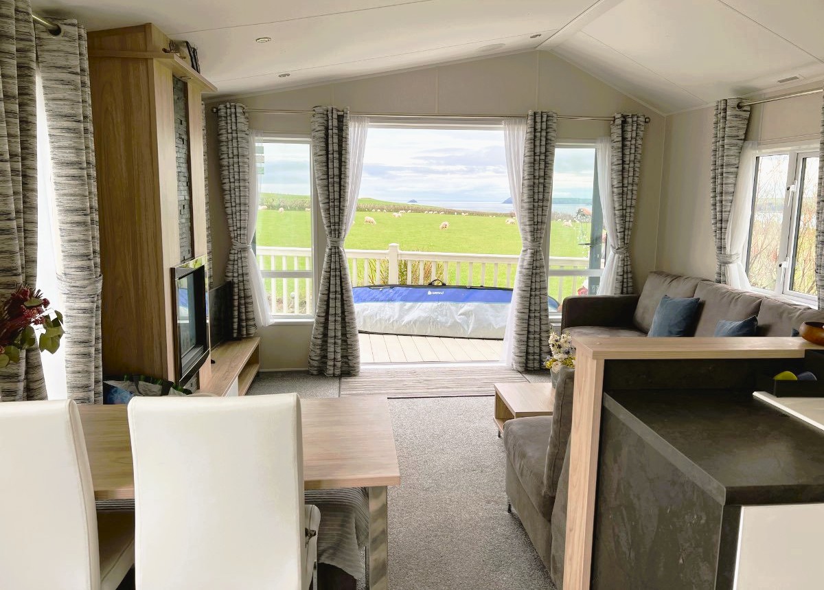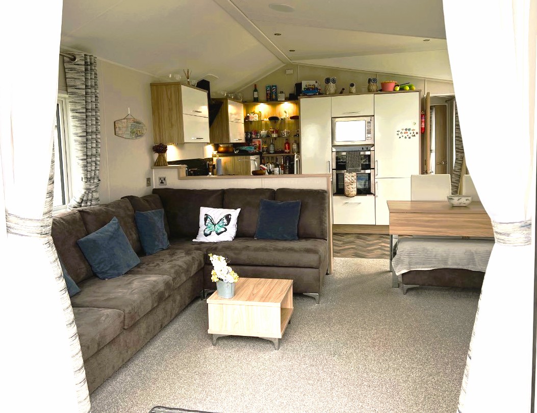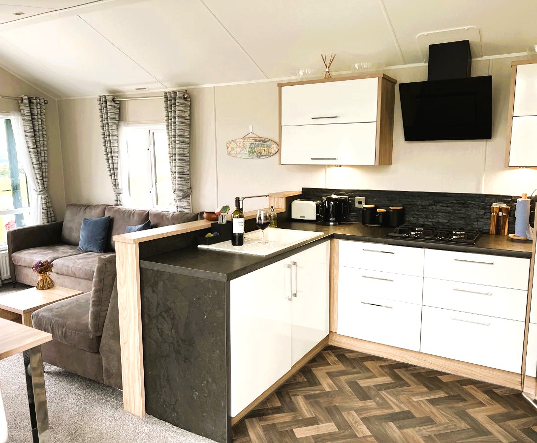 It has a spacious lounge with a corner sofa with a pull out bed and dining area. The caravan has an in-built Bluetooth audio sound system which connects to your phone for your playlist, a TV and DVD player, a selection of books, games and DVD’s. It also has an electric fire and patio doors out to the decking with those breath taking views from your sofa!