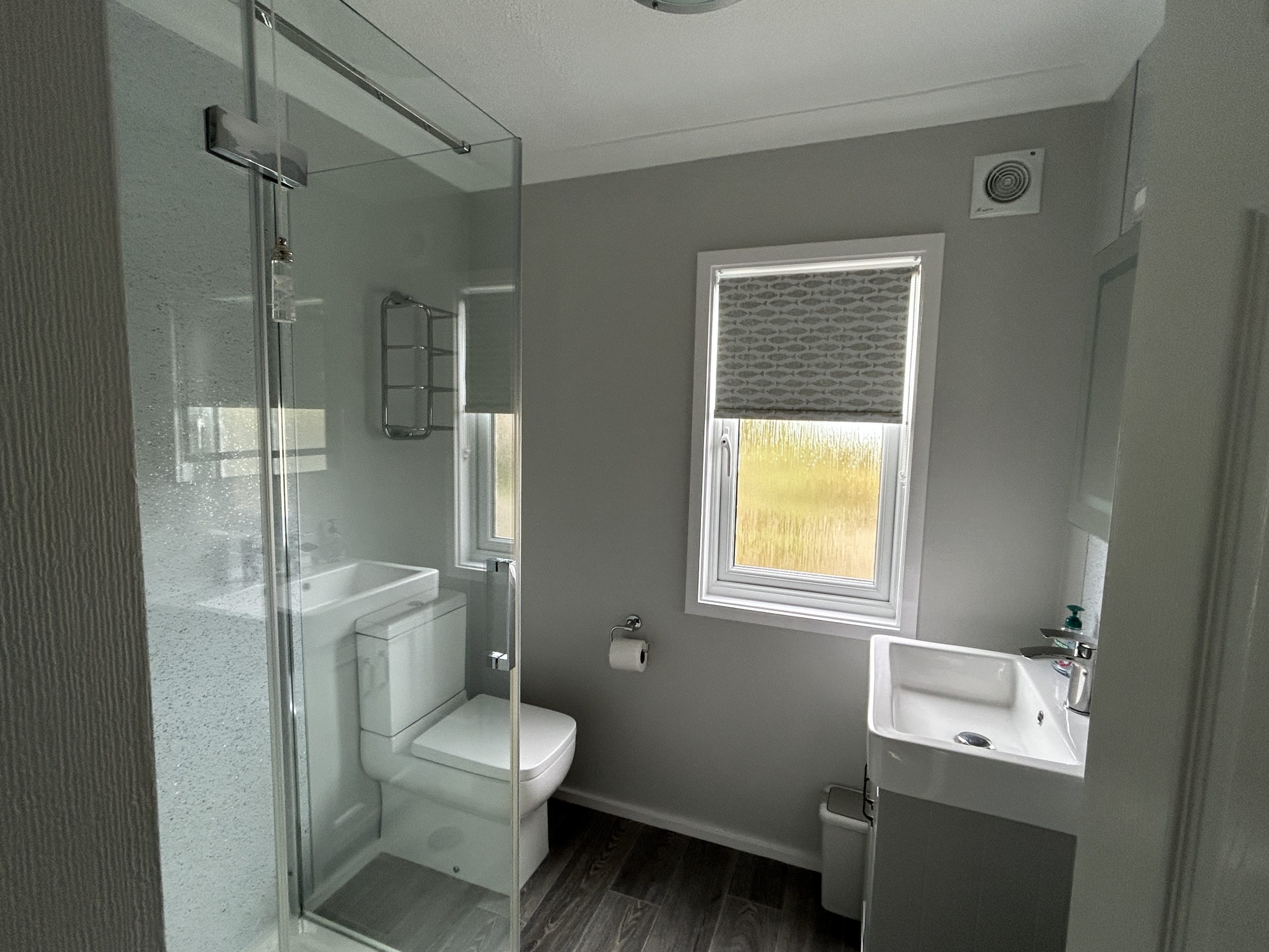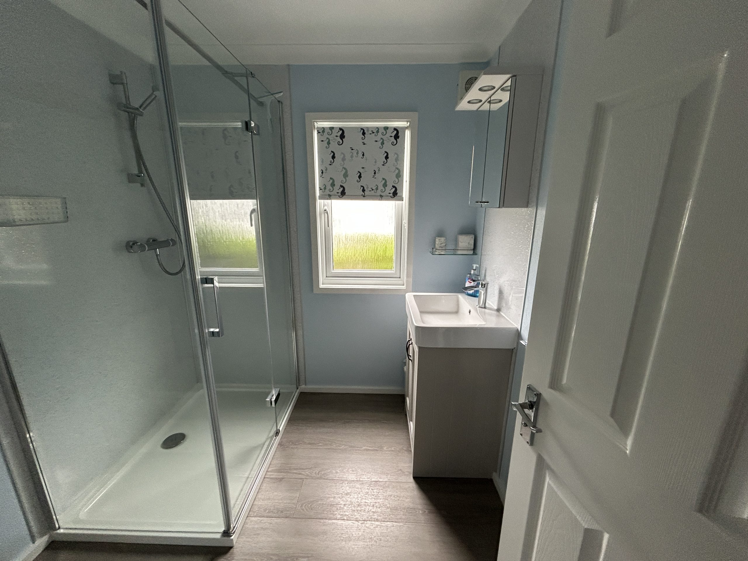There are two double bedrooms (one with en-suite shower room), two single bedrooms (one 3′ single & one 2′ 6″) and good sized family shower room – with a large shower.
